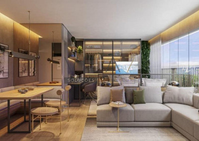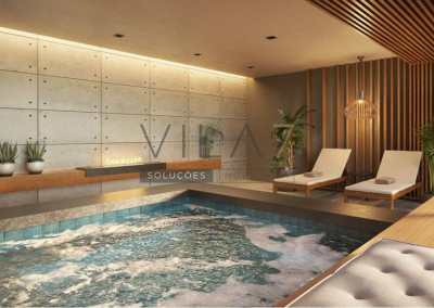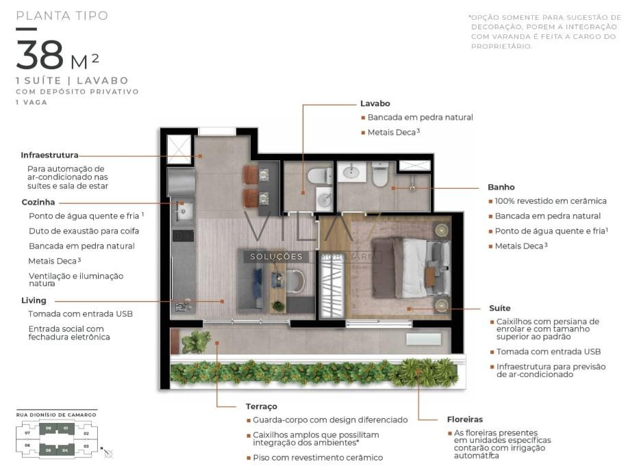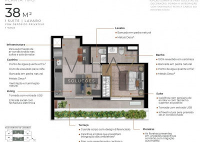 Apartamento 38m², 14º andar, 1 suíte, 1 lavabo, sacada com floreira, infra para ar condicionado, porta com fechadura eletrônica, 1 vaga de garagem, 1 depósito privativo. Espaço comum: piscina aquecida, piscina descoberta, piscina infantil, saúna, 2 churrasqueiras, salão de festas, espaço vip para convidados com piscina e churrasqueira, espaço pet, bicicletário, academia, coworking, car point.