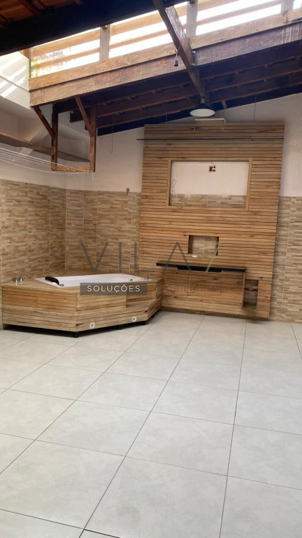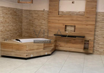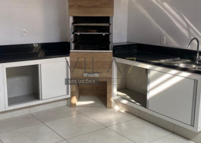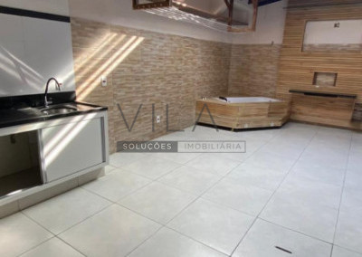 - área de lazer coberta com churrasqueira, pias, rack de TV, hidromassagem e WC completo