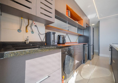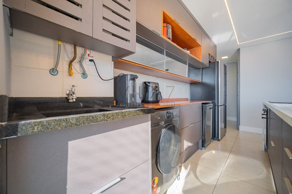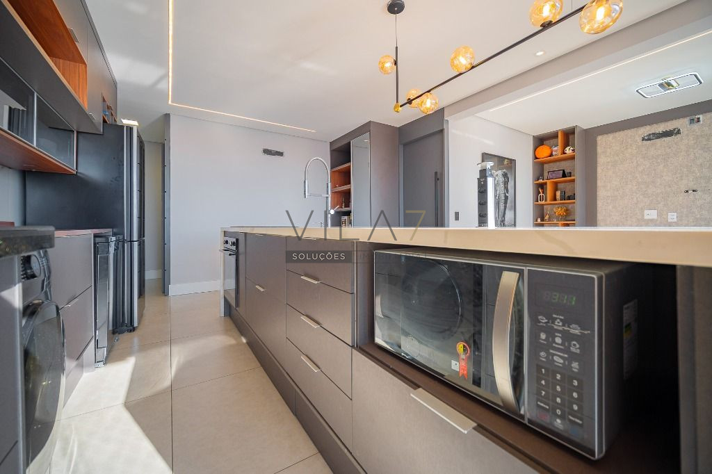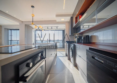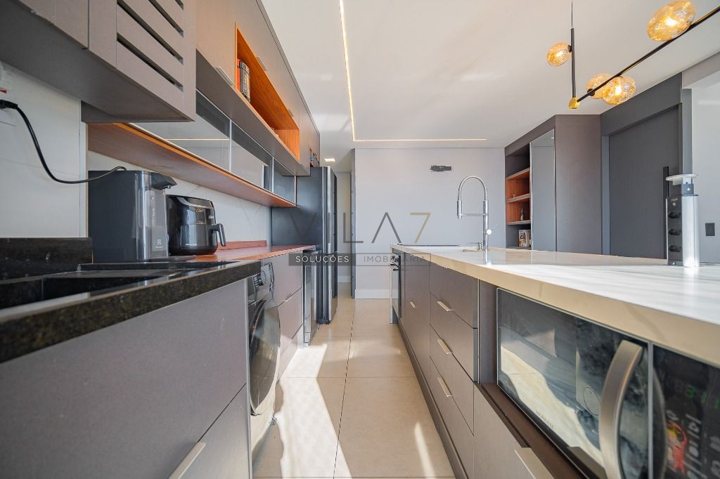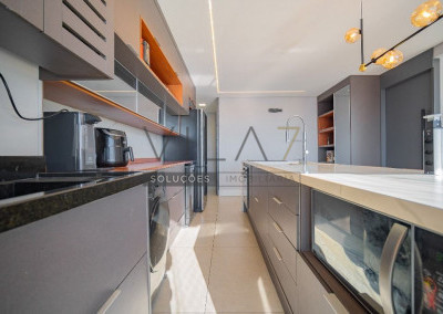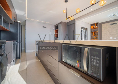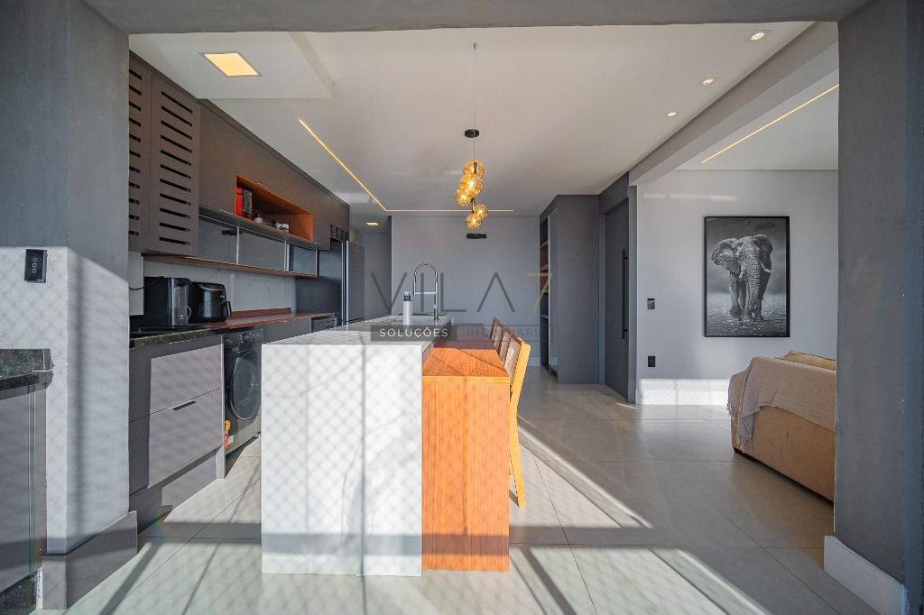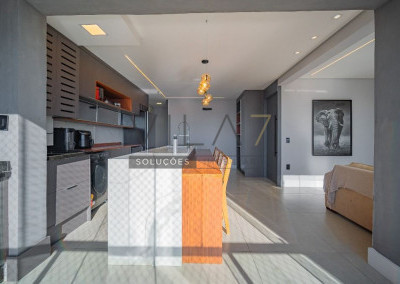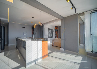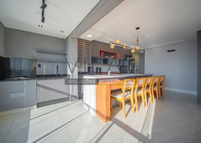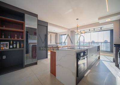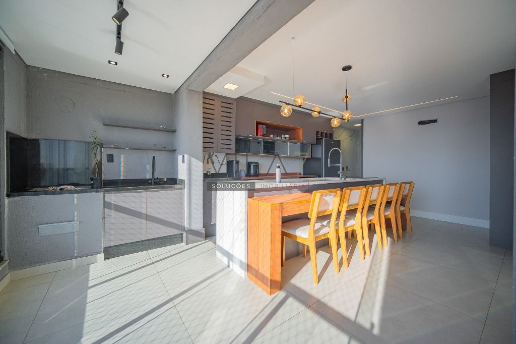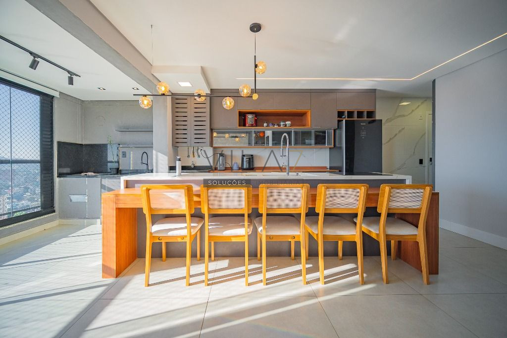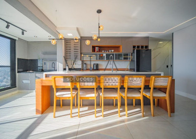 Varanda gourmet integrada à cozinha planejada, perfeita para receber convidados com charme e funcionalidade