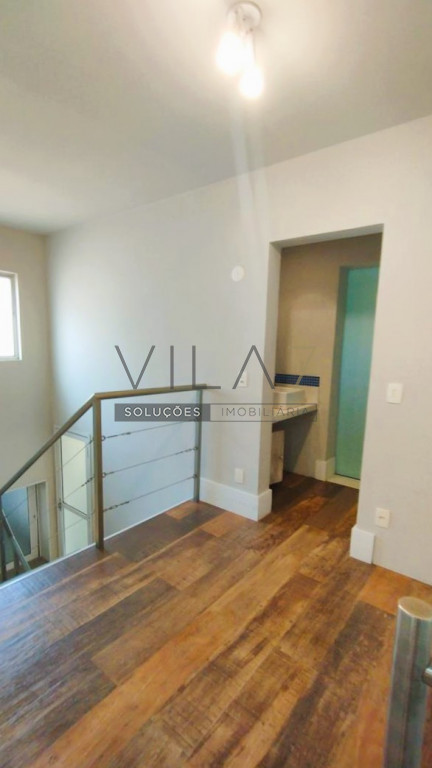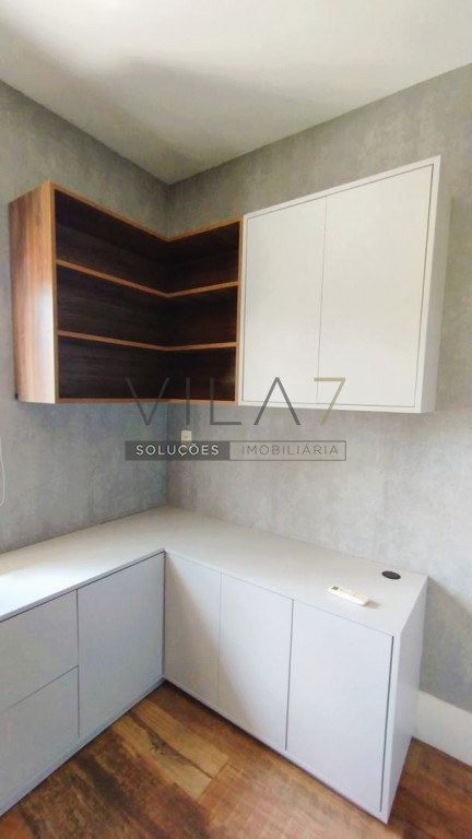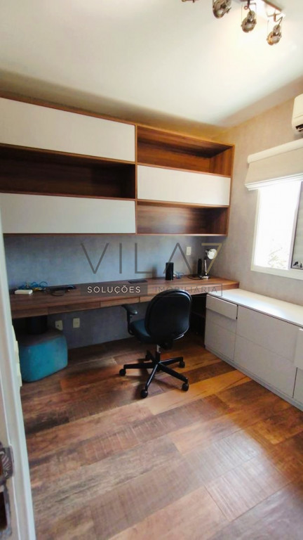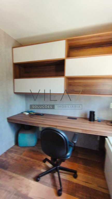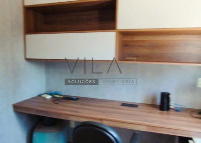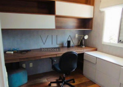 - No andar de cima ficam os quartos, um closet e uma suite diferenciada, com 2 banheiros - para ela e para ele - e um escritório com bancada, armários e estantes.