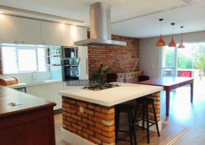 - A parte de baixo é open space, integrando cozinha, sala de jantar e sala de estar com lareira, e vista para um jardim repleto de plantas e árvores frutíferas: limão siciliano, caqui, jabuticaba e cereja brasileira.