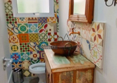 - Tem uma grande área gourmet com churrasqueira, frigobar vintage, fogão a lenha, bancada decorada com azulejos hidráulicos, mesa e bancos em madeira rústica.