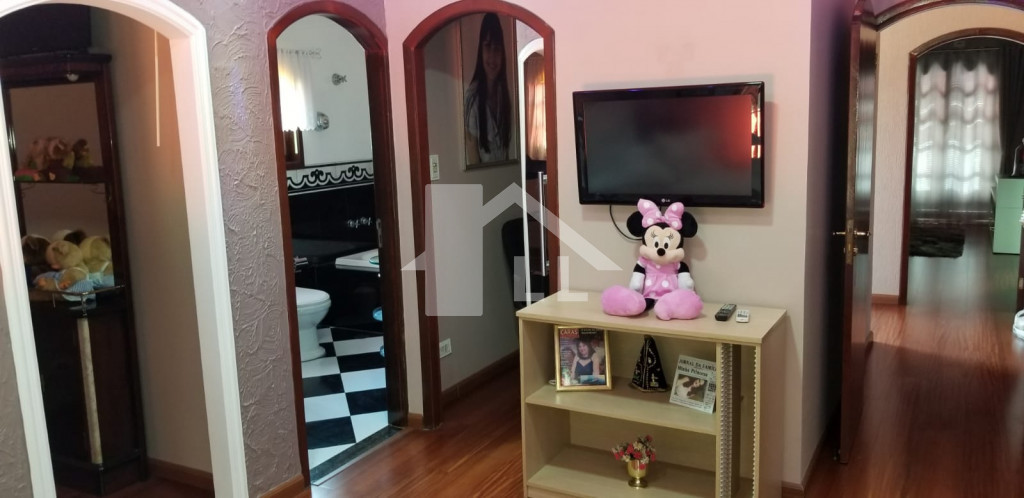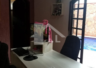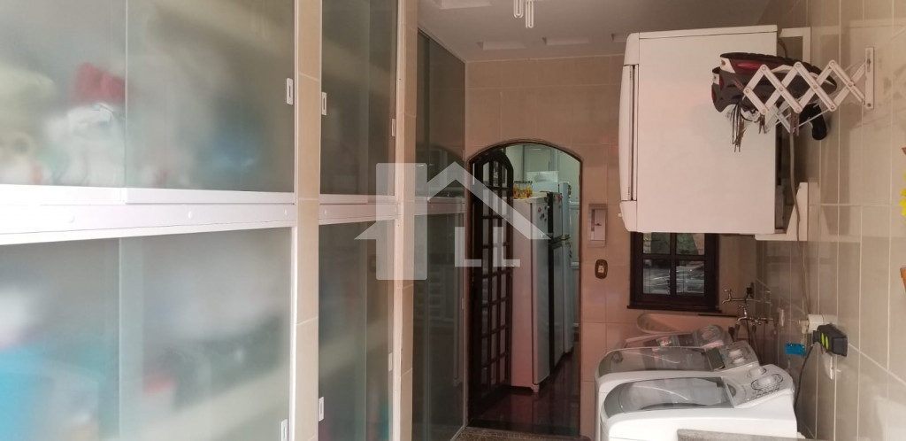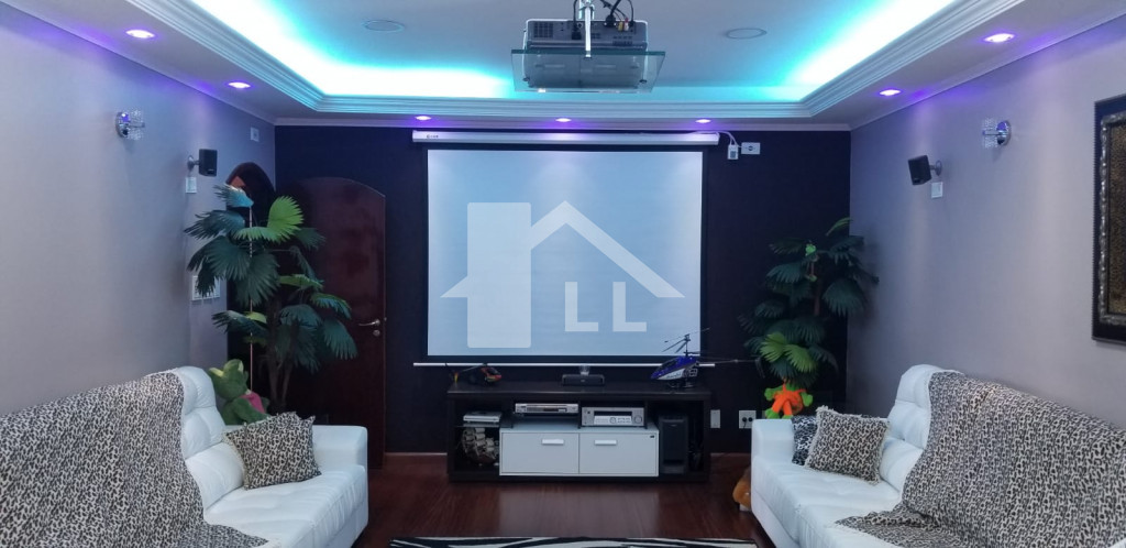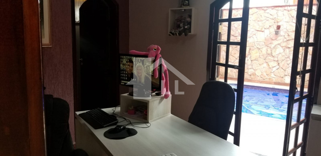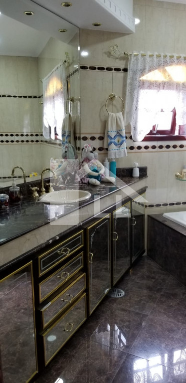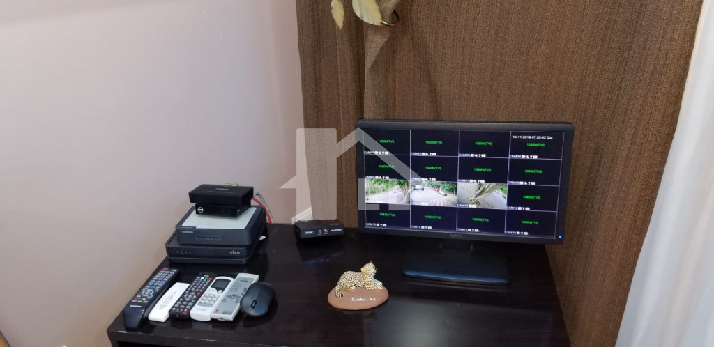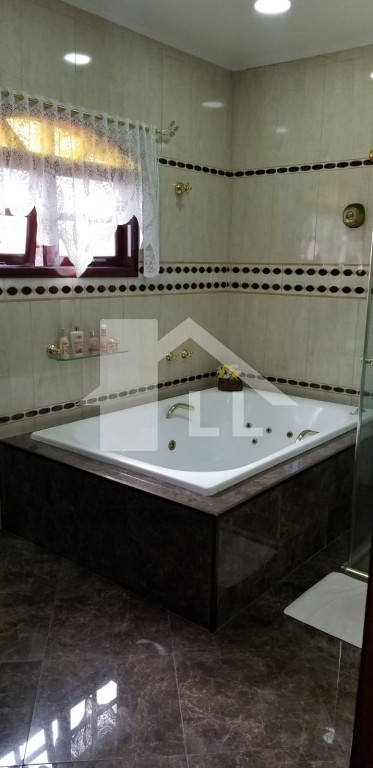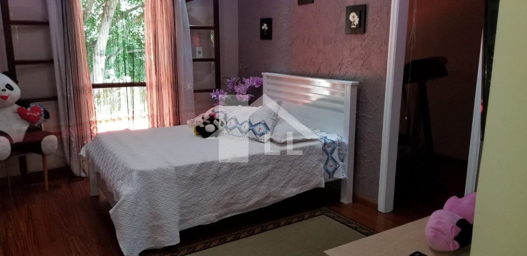 Sobrado com 4 suítes, sendo 2 com closet (1 master com banheira), quarto de serviço com banheiro, sala de jantar, estar e uma linda e ampla sala de CINEMA, cozinha toda planejada com armários de alumínio branco e prateleiras de vidro, despensa, forno elétrico, cooktoop e coifa, lavanderia com armários, jardim de inverno, escada de madeira, sala de ginástica, piscina aquecida com cascata 4x8m começa com 1,20 e vai até 1,80 profundidade com área de churrasqueira coberta, banheiro, 1 escritório independente da casa com ar condicionado, quintal com jardim e sistema automático de irrigação.